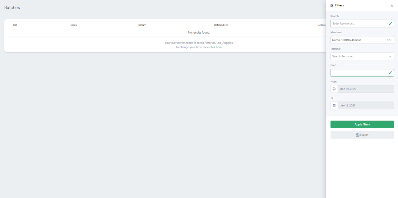 The Batches page enables users to have quick access to their card batch data for your MIDs.